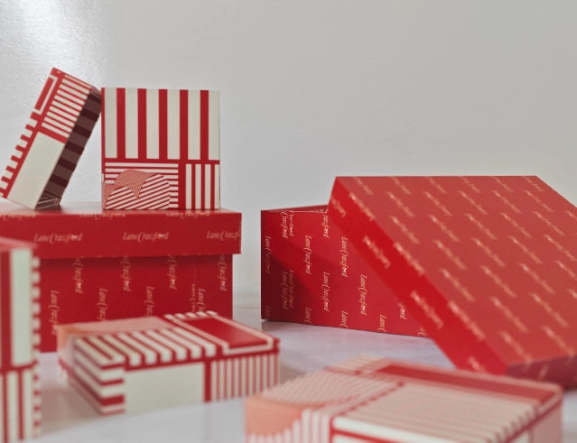 這組聖誕陳列道具以高飽和的紅白條紋視覺為主軸,大面積的幾何愛心圖案於背景中營造出強烈的節日符號感,既醒目又富有節奏。前景層疊陳列的禮盒透過多種尺寸與圖案的組合呈現,搭配色彩明快的針織單品與包裝盒,使整體畫面更具生活氣息與互動感。條紋元素自背景延伸至整個空間,在視覺上形成連續流動的秩序感,並與懸掛展示的商品相互呼應。整體裝置以大膽而輕快的設計語言,營造出充滿歡樂與驚喜的聖誕氛圍,成為櫥窗中極具吸引力的焦點陳列,有效強化品牌於節日期間的年輕化與創意表現。