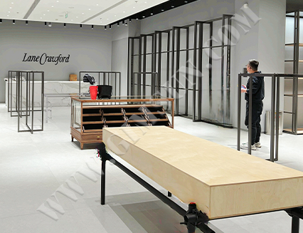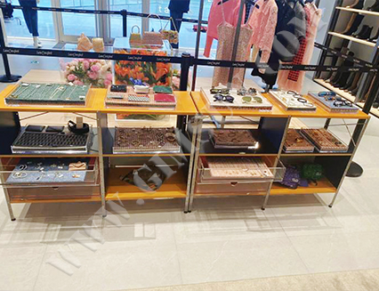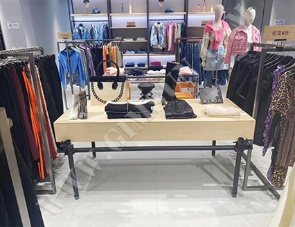 The store utilizes modern minimalist display stands to effectively showcase clothing and accessories. The clever layout of the display stands attracts customers, enhances the shopping experience, and increases product visibility.